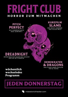 Neben den Inszenierungen bietet das Miskatonic Theater auch interaktive Donnerstagsformate wie das Horror-Game-Show-Format „Dreadnight”, die Comedy-Spielshow „Pitch Perfect”, das Pen & Paper Format „Demokraten & Dragons“ mit gewählten Vertreter*innen aller demokratischen Fraktionen die sich trauen (die CDU bislang nicht), oder internationale Horror-Kurzfilmslams. Alles, was das Herz der genre-affinen Zielgruppe höherschlagen lässt.